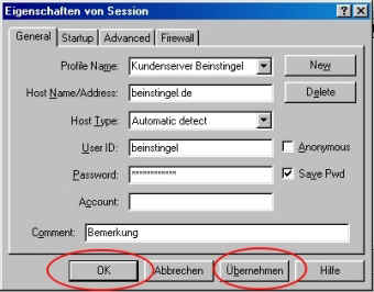 |Übernehmen| und anschließend auf den Button |OK| um die Session zu starten.